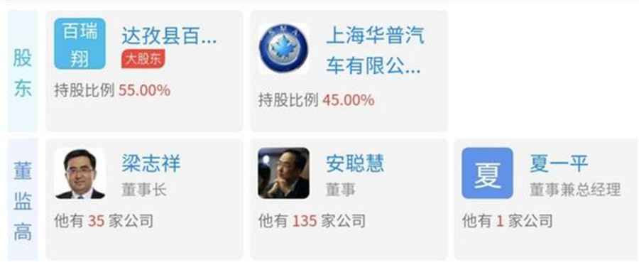 據(jù)天眼查顯示,該公司注冊(cè)資金為20億人民幣,公司法人為夏一平,此人曾任FCA亞太區(qū)智能車聯(lián)事業(yè)部負(fù)責(zé)人,以及摩拜聯(lián)合創(chuàng)始人兼CTO。目前持股股東為達(dá)孜縣百瑞翔創(chuàng)業(yè)投資管理有限責(zé)任公司(55%),上海華普汽車有限公司(45%)。