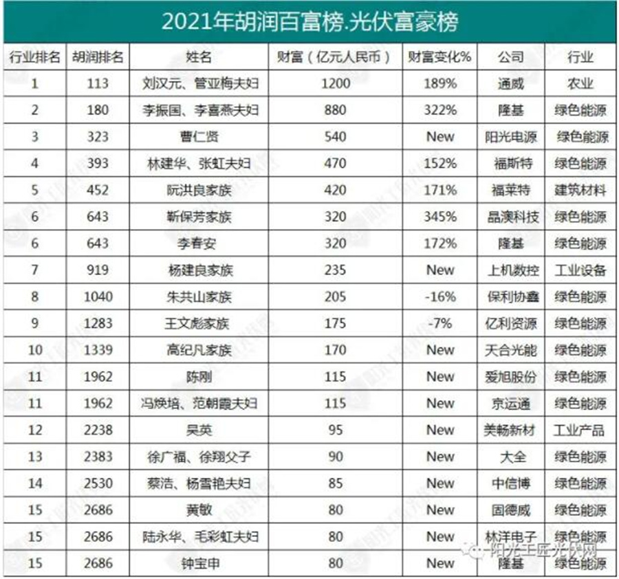 3月2日,胡潤百富榜.富豪榜出爐,共有17家光伏企業(yè)19位/家族/夫婦上榜。