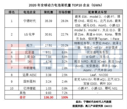 GGII數(shù)據(jù)顯示,2020年全球動(dòng)力電池裝機(jī)量TOP10企業(yè)依次是寧德時(shí)代、LG能源、松下、比亞迪、三星SDI、SKI、中航鋰電、遠(yuǎn)景AESC、國(guó)軒高科和億緯鋰能。