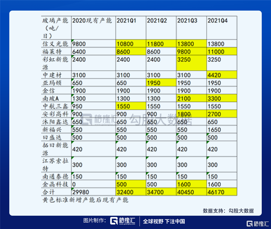 ④光伏玻璃:擴(kuò)產(chǎn)加速鍵在2020Q4才被按下,預(yù)計(jì)2021年可達(dá)到日熔量4.6萬噸,可滿足接近276GW組件需求。