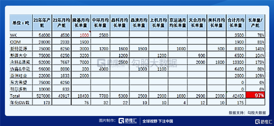 據(jù)統(tǒng)計(jì),2021年僅有通威7.5萬噸于2021年10月和2021年12月底投產(chǎn);大全新能源3.5萬噸于2021年12月底投產(chǎn);亞洲硅業(yè)3萬噸于2021年6月底投產(chǎn);預(yù)計(jì)2021年可達(dá)產(chǎn)能193GW,僅能滿足下游60%的需求。