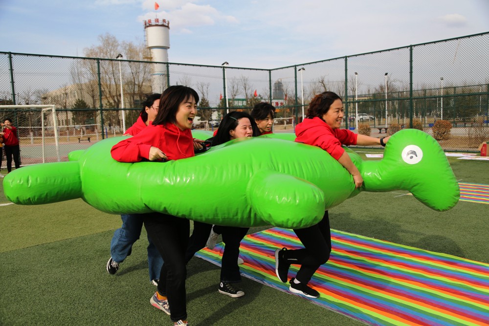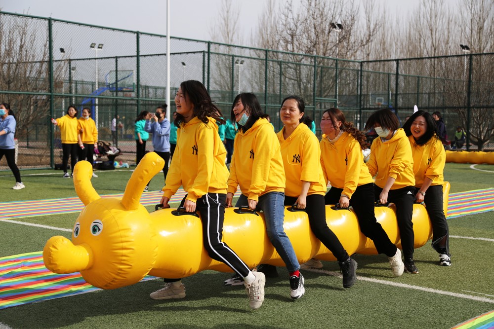 隨后,大家沐浴著和煦春風(fēng),在慶陽市海綿公園西南角足球場進行了簡單的熱身?;顒拥谝粋€環(huán)節(jié)便是充氣毛毛蟲競速,只見每位隊員身手敏捷,騎在毛毛蟲上,齊聲喊著“一二一、左右左”的口號向前走動,現(xiàn)場加油聲甚至蓋過參賽隊員的口號,氣氛異常熱烈。