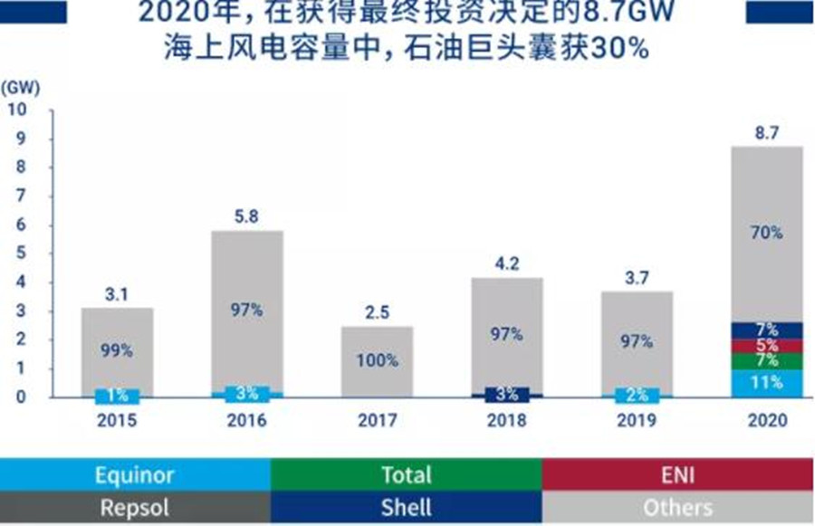現(xiàn)階段的海上風(fēng)電業(yè)務(wù)進(jìn)展如何?石油巨頭進(jìn)入海上風(fēng)電產(chǎn)業(yè)的時間較晚,在運(yùn)營容量共計僅有0.7 GW,占除中國以外全球總?cè)萘康?%。項(xiàng)目多處于早期開發(fā)階段,但項(xiàng)目所處的地理范圍最具多元化特征,同時使用包括浮式風(fēng)電在內(nèi)的更高新技術(shù)。僅2020年,在通過最終投資決定的8.7GW海上風(fēng)電項(xiàng)目容量中,其中30%的容量掌控在石油巨頭手中。
