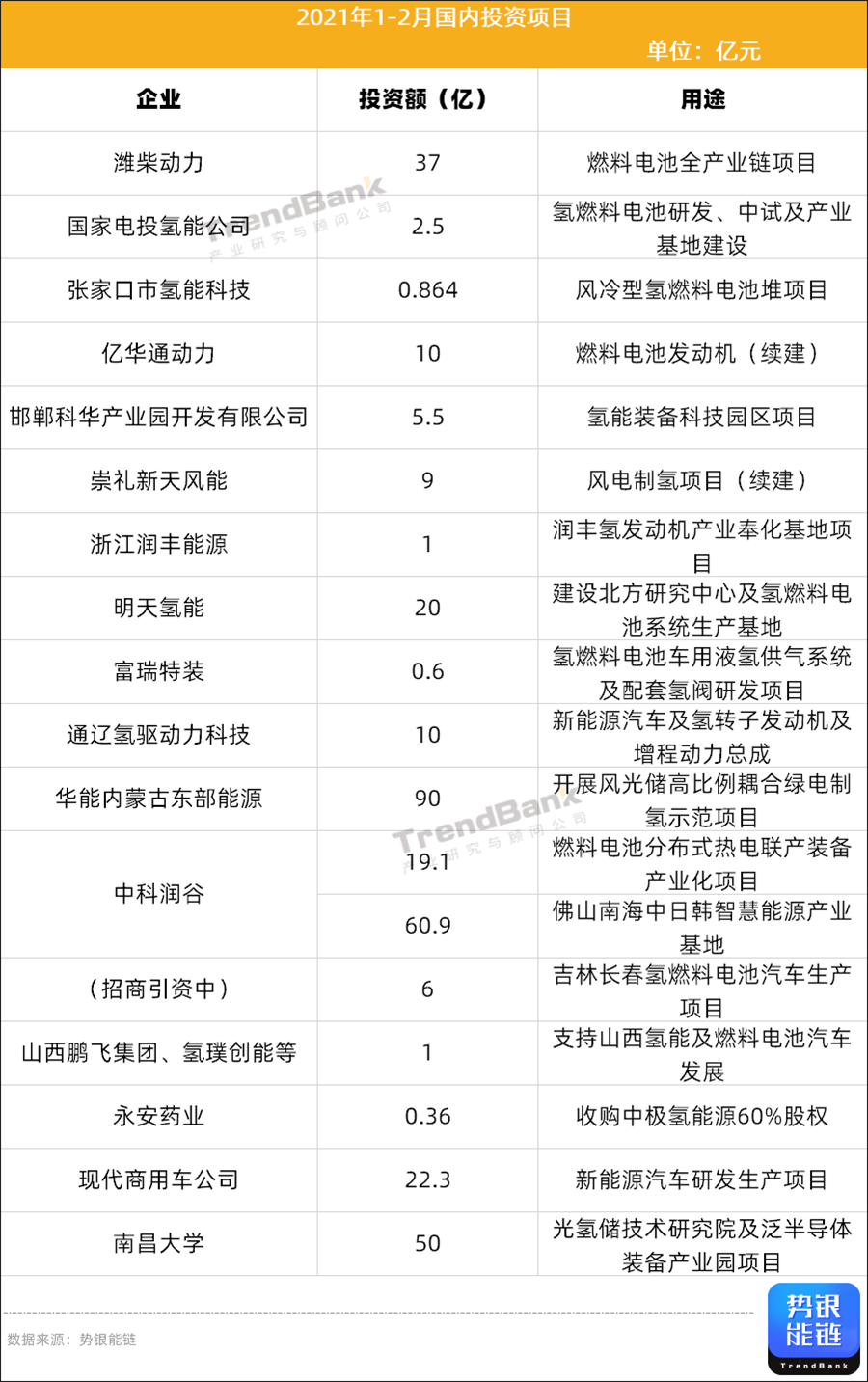 在國(guó)內(nèi),2021年氫電項(xiàng)目投資熱情不減。據(jù)勢(shì)銀能鏈不完全統(tǒng)計(jì),2021年1月和2月,全國(guó)項(xiàng)目總投資/募資金額約346億元。