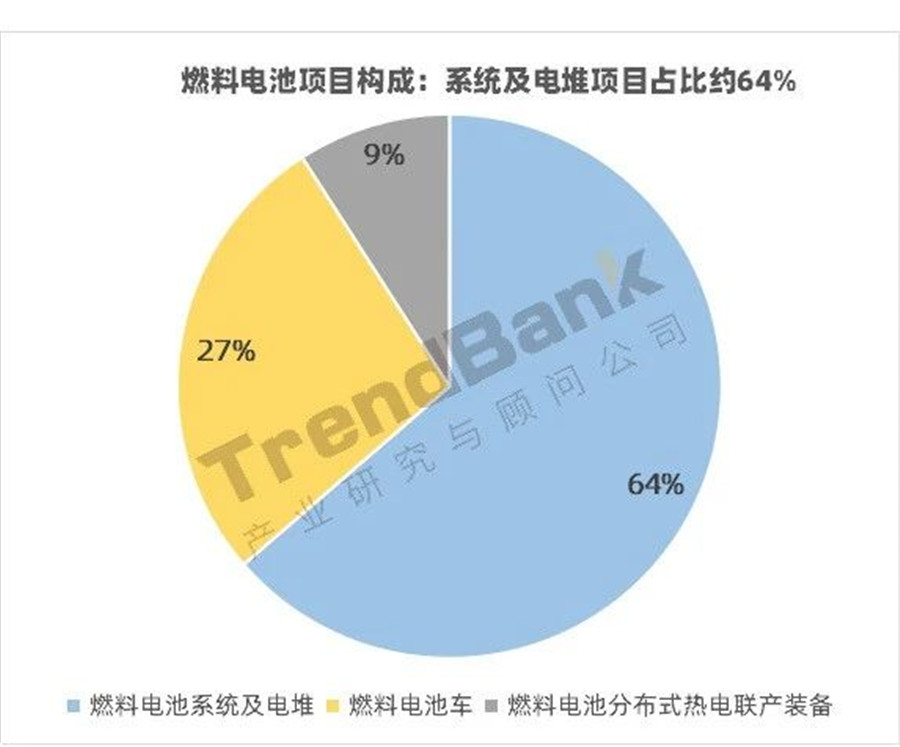在11個(gè)燃料電池項(xiàng)目,燃料電池系統(tǒng)及電堆項(xiàng)目7個(gè),占比約64%;燃料電池車項(xiàng)目3個(gè),占比約27%;燃料電池分布式熱電聯(lián)產(chǎn)裝備項(xiàng)目1個(gè)。