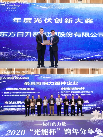 3月3日,2020年度“光能杯”分享會暨頒獎典禮在蘇州隆重舉行,東方日升新能源股份有限公司(簡稱“東方日升”)擷取了“年度光伏創(chuàng)新大獎”,以及由索比光伏網(wǎng)和鑒衡認證聯(lián)合頒發(fā)的“最具影響力光伏組件企業(yè)——創(chuàng)新突破先鋒獎”,企業(yè)實力再獲行業(yè)認可。