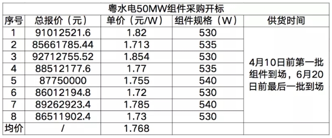 3月10日,遂溪縣粵水電官田水庫(kù)50MW光伏項(xiàng)目組件采購(gòu)開標(biāo),共8家組件企業(yè)參與投標(biāo)。本次招標(biāo)組件規(guī)格為530W以上單晶雙玻組件,最高投標(biāo)報(bào)價(jià)為1.854元/W,最低報(bào)價(jià)為1.713元/W,均價(jià)為1.768元/W。具體開標(biāo)價(jià)格見下: