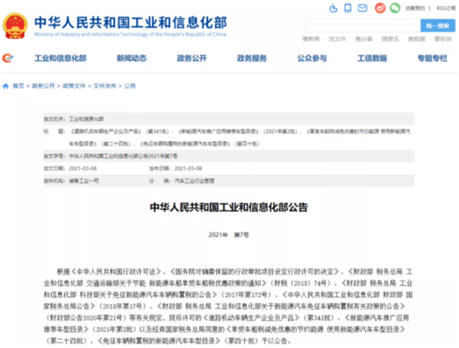 3月8日,工信部通公布了數(shù)個(gè)新能源汽車相關(guān)的政策性文件,其中就包括《免征車輛購(gòu)置稅的新能源汽車車型目錄》(第四十批)。