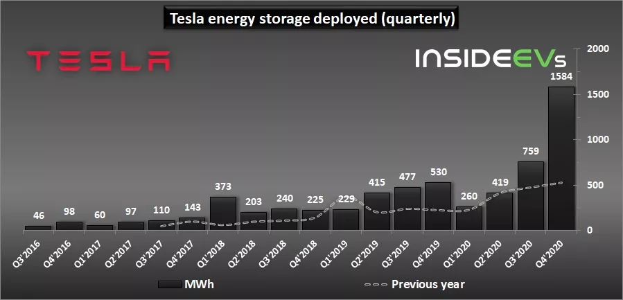 2020年Q4,特斯拉儲(chǔ)能產(chǎn)品裝機(jī)量達(dá)到1.58GWh,同比增長(zhǎng)198.9%、環(huán)比增長(zhǎng)108.7%;2020年全年裝機(jī)總量為3.02GWh,同比增長(zhǎng)83%。
