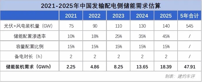 以光伏+風(fēng)電裝機(jī)增量為測(cè)算依據(jù),并考慮儲(chǔ)能配置滲透率逐漸提升,容量配置比例取15%,容量時(shí)長(zhǎng)取2小時(shí),預(yù)計(jì)我國(guó)2021-2025年發(fā)輸配電側(cè)(即電表前端)的儲(chǔ)能裝機(jī)需求約為48GWh。