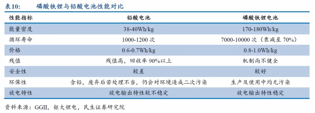 磷酸鐵鋰電池能量密度可達(dá)鉛酸電池的4-5倍,且在安全性、循環(huán)壽命、快速充放性能等方面優(yōu)勢(shì)明顯。盡管目前磷酸鐵鋰電池價(jià)格仍高于鉛酸電池,但在全生命周期成本評(píng)價(jià)體系下,由于擁有更長(zhǎng)的循環(huán)壽命,磷酸鐵鋰電池已幾乎抹平了成本劣勢(shì),且未來(lái)幾年仍有降本空間。