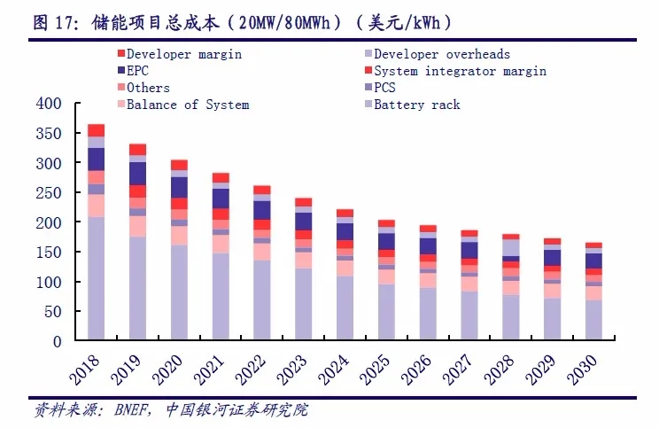 與之對(duì)應(yīng)地,根據(jù)BNEF調(diào)研,2019年一個(gè)完成安裝的4小時(shí)電站級(jí)儲(chǔ)能系統(tǒng),成本范圍在300-445美元/kWh之間。BNEF預(yù)測(cè),2020年單kWh成本仍將高于300美元,至2025和2030年有望降至203美元和165美元。