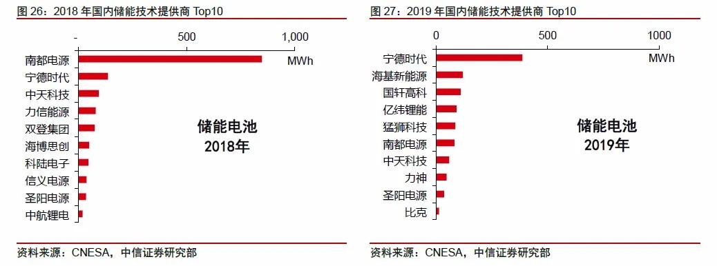 對(duì)比2018-2019年中國(guó)儲(chǔ)能技術(shù)提供商(即電池提供商)Top10企業(yè)的變化即可看到,寧德時(shí)代、國(guó)軒高科、億緯鋰能等國(guó)內(nèi)動(dòng)力電池領(lǐng)先企業(yè),儲(chǔ)能裝機(jī)量均在2019年取得了明顯的同比增長(zhǎng)。