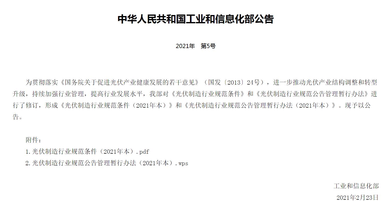 (五)本規(guī)范條件自2021年3月15日起實施。2018年1月15日公布的《光伏制造行業(yè)規(guī)范條件(2018年本)》(工業(yè)和信息化部公告2018年第2號)同時廢止。