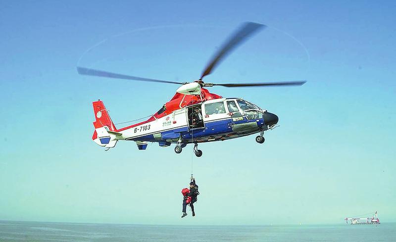 此次演習(xí)模擬海上風(fēng)電場工程項(xiàng)目F49號樁,施工過程中突發(fā)機(jī)械傷害事故,造成1名作業(yè)人員受傷,緊急調(diào)配直升機(jī)開展救援。模擬的事故現(xiàn)場距離海岸72公里,普通交通船從碼頭行駛至風(fēng)電場,單程需5小時左右;將傷員從風(fēng)電場轉(zhuǎn)移到岸上最近的中心醫(yī)院需7小時左右。而此次使用直升機(jī)救援,從陸上臨時起降點(diǎn)起飛,到將傷員送上救護(hù)車,僅用時1小時。