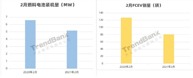 2021年2月燃料電池裝機量為5.171MW(2020年2月裝機量為6.598MW),同比下降21.63%;