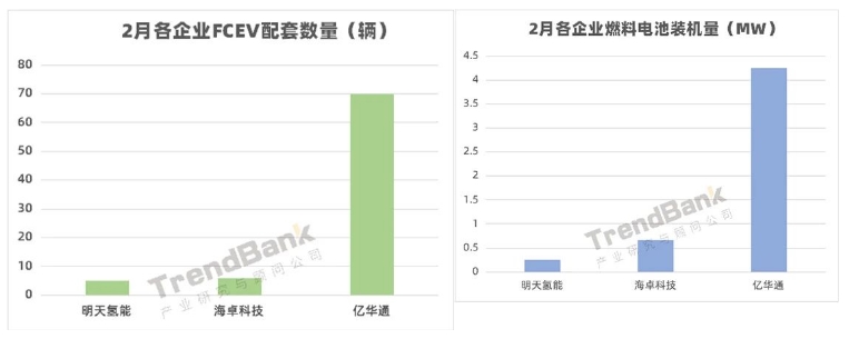 從配套企業(yè)來看,二月銷售的81輛FCEV由億華通、明天氫能、海卓科技等三家企業(yè)配套,其中,億華通無論是裝機量還是配套數(shù)量,都為第一;海卓科技裝機量與配套數(shù)量都位列第二。