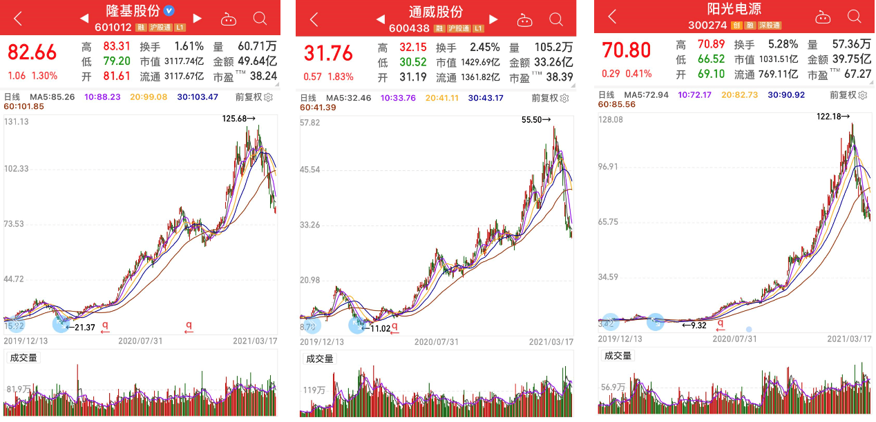經(jīng)歷了前段時(shí)間股價(jià)的持續(xù)下挫,2021年3月15日,光伏行業(yè)“三巨頭”隆基股份、通威股份、陽光電源的股價(jià)再次經(jīng)歷了集體重挫。3月16日,A股光伏板塊略顯止跌企穩(wěn)跡象,以隆基股份(81.600, -0.37, -0.45%)、通威股份(31.190, 0.09, 0.29%)為代表的行業(yè)龍頭沒有再大幅殺跌。有人高呼:光伏雙雄隆基股份、通威股份跌得快把高瓴套住了,是時(shí)候抄底了!