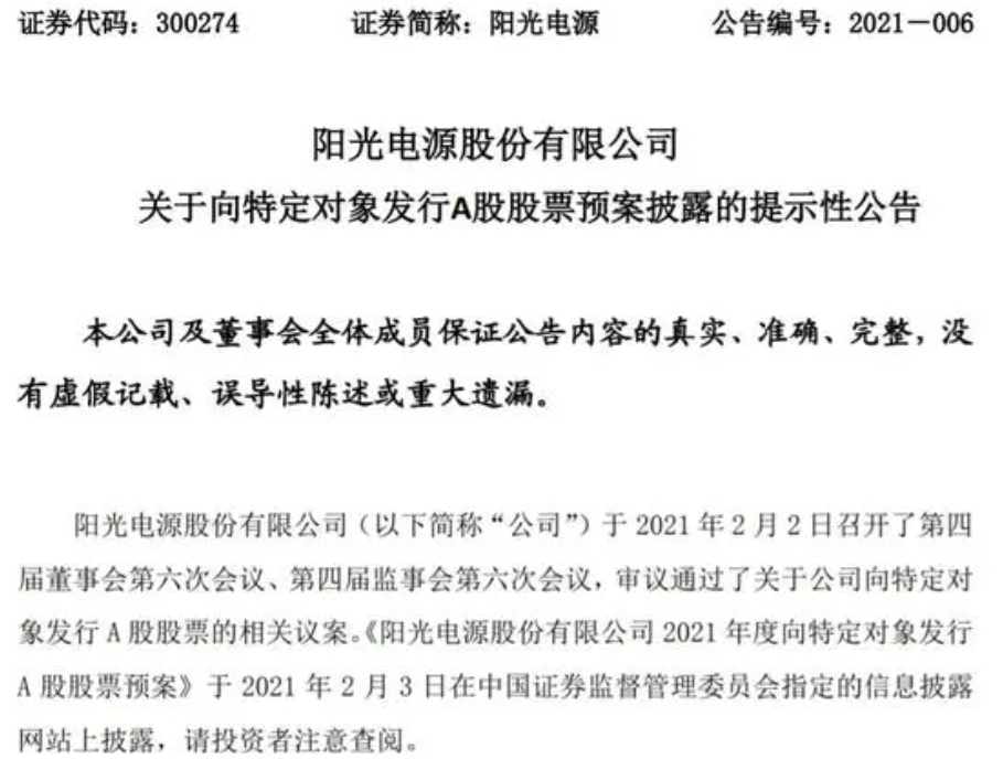2021年2月2日晚間,“光伏三劍客”之一的陽光電源發(fā)布定增募資公告。