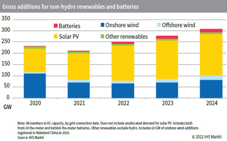 【電纜網(wǎng)訊】根據(jù)國際市場研究機構IHS Markit的白皮書,全球每年可再生能源發(fā)電容量增量將從2020年的200吉瓦增加到2022年的約250吉瓦,然后到2024年增加到300吉瓦以上。
