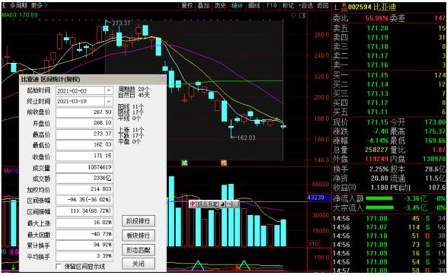 3月19日,比亞迪大跌4.1%。截止收盤,股價報收于171元,成交額44億,總市值為4897億。