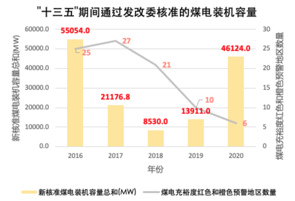 圖1.2016年至2020年通過發(fā)改委核準(zhǔn)的煤電裝機(jī)總量變化趨勢以及國家能源局在2016年至2020年每年發(fā)布的煤電裝機(jī)充裕度預(yù)警為紅色和橙色的地區(qū)數(shù)量變化。
