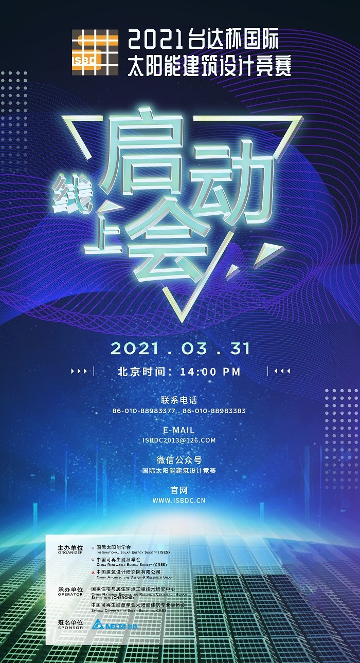 由國際太陽能學會、中國可再生能源學會、中國建筑設計研究院有限公司主辦,國家住宅與居住環(huán)境工程技術研究中心、中國可再生能源學會太陽能建筑專業(yè)委員會承辦,全國高等學校建筑學學科指導委員會技術指導,臺達集團冠名的2021年臺達杯國際太陽能建筑設計競賽空中啟動會將于北京時間2021年3月31日下午兩點正式啟動!啟動會采用線上直播的方式,數(shù)位業(yè)界大咖齊聚直播間,與您“面對面”交流互動(參與方式見海報或關注國際太陽能建筑設計競賽微信公眾號)。