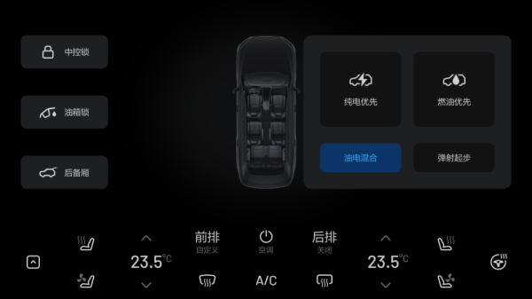 燃油優(yōu)先模式:可在任意電量切換至燃油優(yōu)先模式,當(dāng)電量低于69%時(shí)會(huì)啟動(dòng)增程器,優(yōu)先用油發(fā)電。燃油優(yōu)先的電量保持能力分為標(biāo)準(zhǔn)和強(qiáng),后者更適合冬季使用。