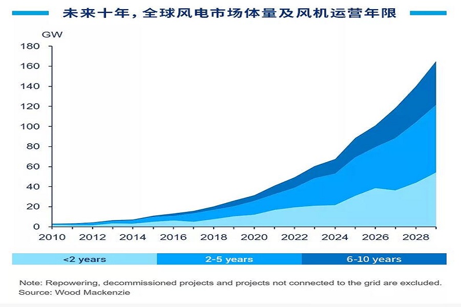 全球海上風(fēng)電運維市場仍未成熟,在面臨長期運維問題與機組故障時缺乏經(jīng)驗。目前,全球僅1.8GW的海上風(fēng)電項目運營時長超過10年。預(yù)計至2029年,該容量將增至約20GW。然而,屆時近90%的在運行機組(即165GW容量)運行時長仍將不足10年。