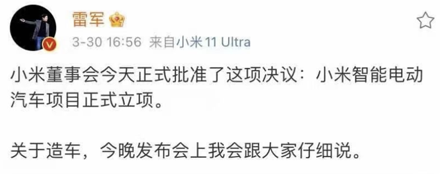 3月30日,“曠日持久”的小米發(fā)布會(huì)來(lái)到了第二天,而就在晚上發(fā)布會(huì)開(kāi)始的前夕,網(wǎng)上突然傳出了“小米正式進(jìn)軍造車行業(yè)”的消息,并且還得到了雷軍本人的官方確認(rèn)。