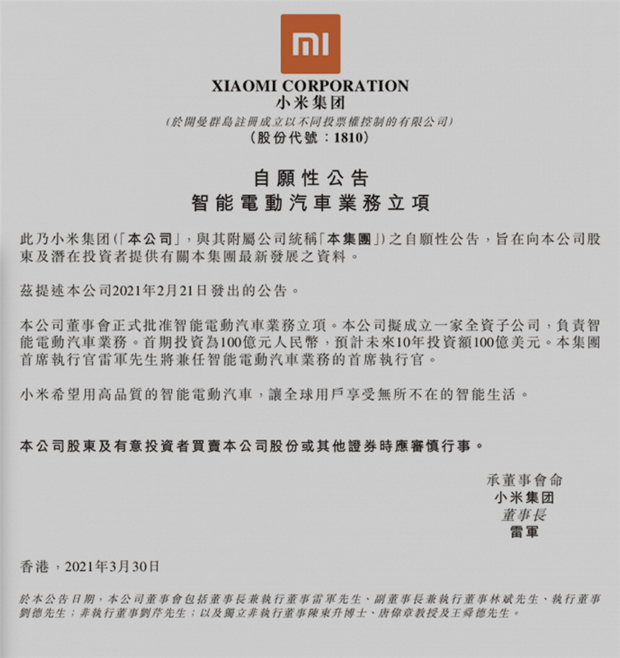 在小米集團(tuán)發(fā)布的“智能電動(dòng)汽車業(yè)務(wù)立項(xiàng)”的公告中,提到了三點(diǎn)核心要素: