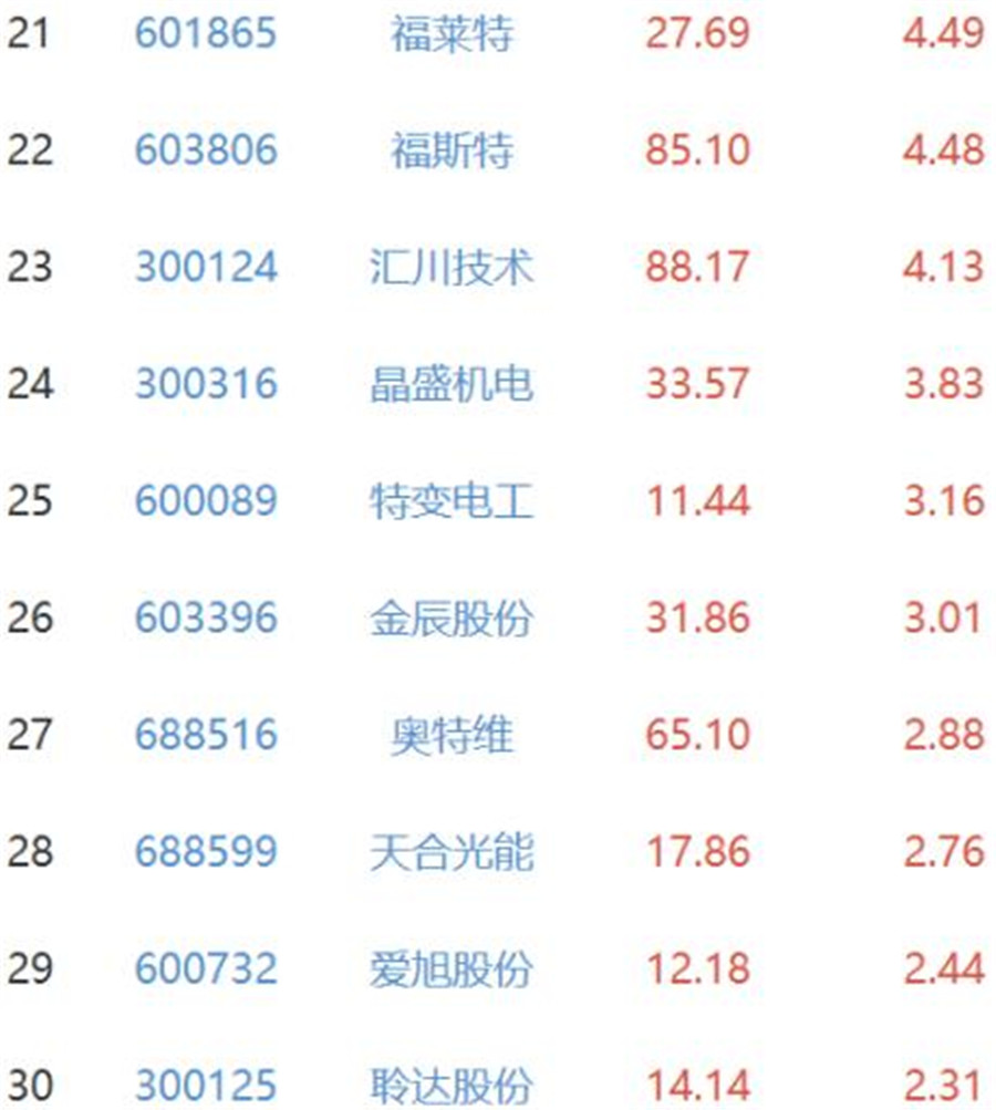 此次上漲的光伏股都是行業(yè)內(nèi)的細(xì)分產(chǎn)業(yè)領(lǐng)軍企業(yè),比如組件類包括:天合光能、晶澳科技、隆基股份、東方日升等。在多晶硅、硅片等上游,通威股份、中環(huán)股份、新特能源等也在大漲個(gè)股中。逆變器方向上,錦浪科技、上能電氣、陽(yáng)光電源及固德威等全部暴漲。電池及輔材方向上,愛旭科技、福斯特、福萊特、海優(yōu)新材、中信博、亞瑪頓等都有所上揚(yáng)。龍頭股和成長(zhǎng)股顯現(xiàn)了良好的漲幅走勢(shì)。