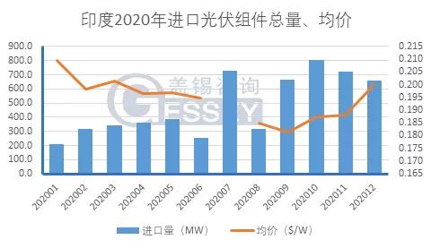 蓋錫咨詢(“GESSEY”)最新報告顯示,2020全年,印度進(jìn)口光伏組件5.7GW,其中10月創(chuàng)出單月進(jìn)口量最高峰,單月進(jìn)口805.5MW。進(jìn)口組件均價在9月觸底反彈,10月進(jìn)口組件均價0.188$/W,12月反彈至0.200$/W,進(jìn)口總量656.7MW。