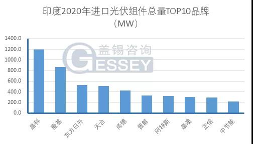 根據(jù)報告數(shù)據(jù),2020全年,在印度流通光伏組件品牌以全球知名光伏組件品牌為主。其中,晶科、隆基、東方日升、天合、尚德位列印度全年進(jìn)口光伏組件總量TOP5。晉能、阿特斯、晶澳、正信、中節(jié)能處于印度光伏組件出貨量第二梯隊,分列6至10名。TOP10企業(yè)占印度全年組件進(jìn)口總量的87%,頭部效應(yīng)顯著。