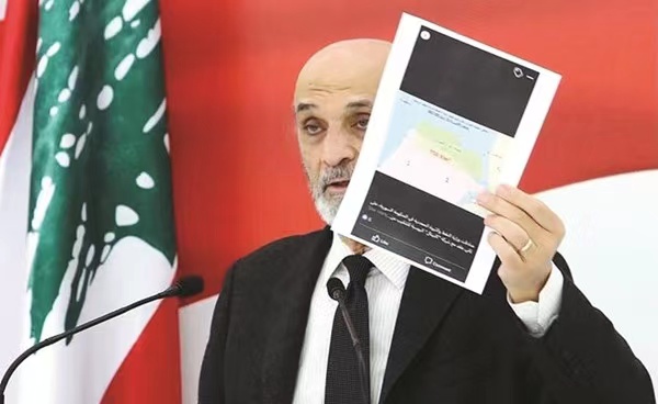 △黎巴嫩力量黨主席賈加在發(fā)布會上展示有爭議海域
