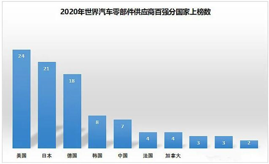 2020年6月29日,《美國汽車新聞》發(fā)布了2020年全球汽車零部件配套供應(yīng)商百強榜。你能想到,已經(jīng)多年汽車產(chǎn)銷量世界第一的中國,只有7家公司上榜么?這個數(shù)字,連韓國都不如,韓國都有8家,比中國還多一家。