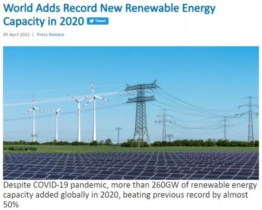 據(jù)國(guó)際可再生能源機(jī)構(gòu)(IRENA)剛剛發(fā)布的《 2021 年可再生能源統(tǒng)計(jì)》,雖然發(fā)生了 COVID-19 疫情,2020年全世界增加了超過 260 吉瓦(GW)的可再生能源裝機(jī)容量,比 2019年的增長(zhǎng)量增加了近 50%,新增可再生能源裝機(jī)容量創(chuàng)歷史新高。