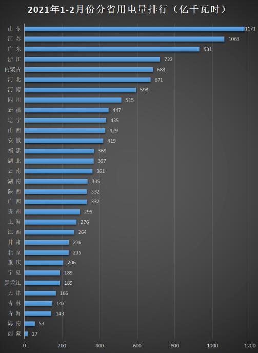 1-2月份,全國(guó)累計(jì)用電量最高的省份是山東(1171億千瓦時(shí)),江蘇(1063億千瓦時(shí))位列第二,西藏(17億千瓦時(shí))最低。分省用電量排行如下圖所示。