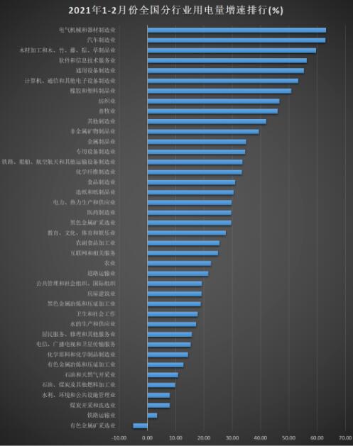 今年1-2月份,全國(guó)主要經(jīng)濟(jì)指標(biāo)均出現(xiàn)大幅回升,用電量的同比指標(biāo)也呈現(xiàn)大幅增長(zhǎng)。其中,租賃和商務(wù)服務(wù)業(yè)、建筑業(yè)、批發(fā)和零售業(yè)、住宿和餐飲業(yè)、工業(yè)、房地產(chǎn)業(yè)、公共服務(wù)及管理組織、金融業(yè)、農(nóng)林牧漁業(yè)的累計(jì)用電量增速與去年同期相比,均提高了20個(gè)百分點(diǎn)以上。