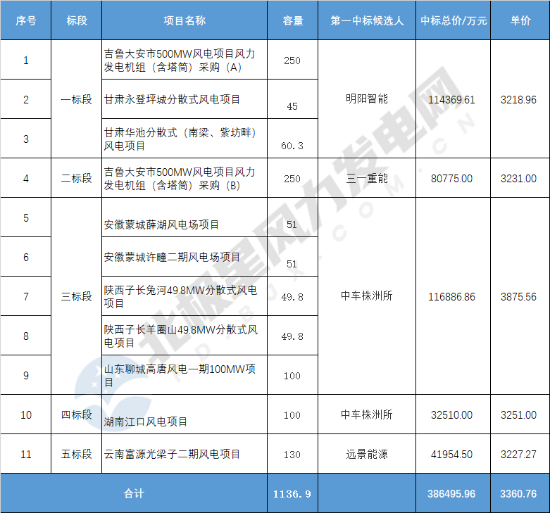 4月5日,華能集團(tuán)公示華能富源光梁子二期等11個(gè)風(fēng)電項(xiàng)目共計(jì)1136.9MW風(fēng)力發(fā)電機(jī)組及其附屬設(shè)備(含塔筒)集中采購(gòu)結(jié)果。