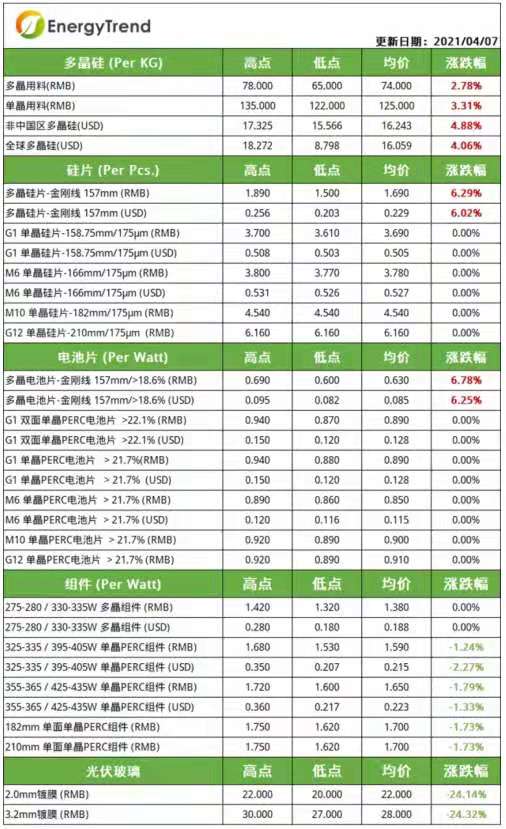 4月7日,國(guó)際知名咨詢機(jī)構(gòu)EnergyTrend發(fā)布公告稱(chēng),硅料價(jià)格再創(chuàng)新高達(dá)到135元/kg,漲幅3.31%。