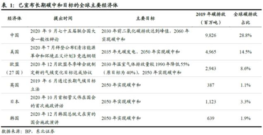 并且2020年下半年以來,全球主要經(jīng)濟(jì)體陸續(xù)提出長期“碳中和”目標(biāo),當(dāng)下減排已成全球共識。