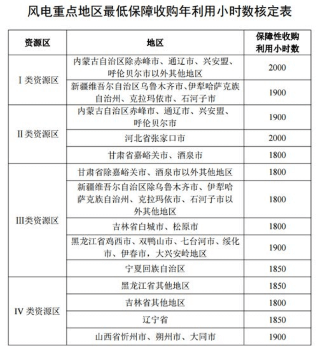 風(fēng)電一類、二類、三類、四類資源區(qū)項目全生命周期合理利用小時數(shù)分別為48000小時、44000小時、40000小時和36000小時。海上風(fēng)電全生命周期合理利用小時數(shù)為52000小時。
