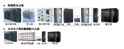 數(shù)據(jù)中心傳統(tǒng)的UPS供電方案,是由高壓配電柜、變壓器、低壓配電柜、UPS等組成,雖然系統(tǒng)方案成熟,但由于設(shè)備種類數(shù)量多,電能變換環(huán)節(jié)多,占地面積大,轉(zhuǎn)換效率低,已有被逐步淘汰的趨勢。