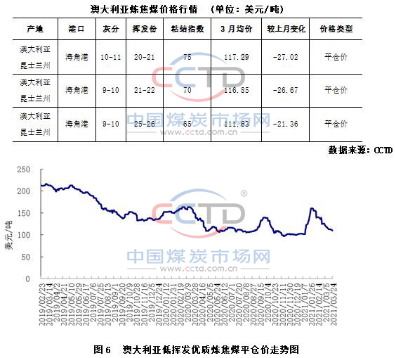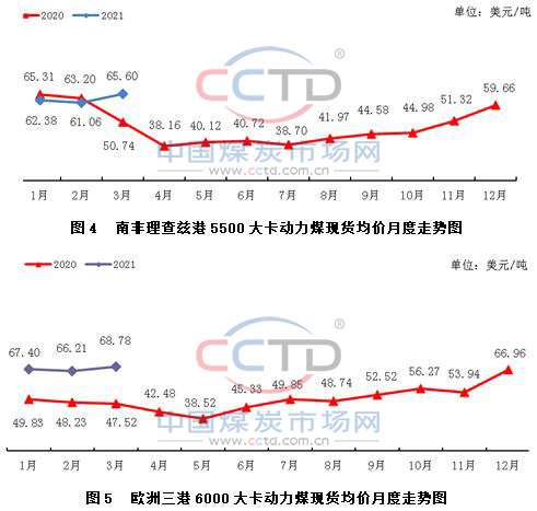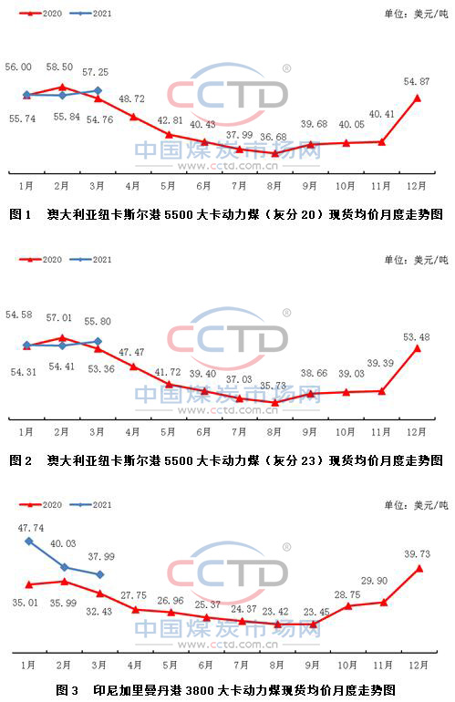 截至2021年3月下旬,澳大利亞紐卡斯?fàn)柛?月份5500大卡動力煤(灰分20)現(xiàn)貨均價報收于57.25美元/噸,同比上漲2.48美元/噸,漲幅為4.54%,月環(huán)比上漲1.41美元/噸,漲幅為2.52%;澳大利亞紐卡斯?fàn)柛?月份5500大卡動力煤(灰分23)現(xiàn)貨均價報收于55.80美元/噸,同比上漲2.44美元/噸,漲幅為4.58%,月環(huán)比上漲1.40美元/噸,漲幅為2.56%;印尼加里曼丹港3月份3800大卡動力煤現(xiàn)貨均價報收于37.99美元/噸,同比上漲5.57美元/噸,漲幅為17.18%,月環(huán)比下降2.03美元/噸,降幅為5.07%;南非理查茲港3月份5500大卡動力煤現(xiàn)貨均價報收于65.60美元/噸,同比上漲14.86美元/噸,漲幅為29.29%,月環(huán)比上漲4.55美元/噸,漲幅為7.44%;歐洲三港3月份6000大卡動力煤現(xiàn)貨均價報收于68.78美元/噸,同比上漲21.26美元/噸,漲幅為44.75%,月環(huán)比上漲2.57美元/噸,漲幅為3.88%。具體價格走勢情況見下圖。