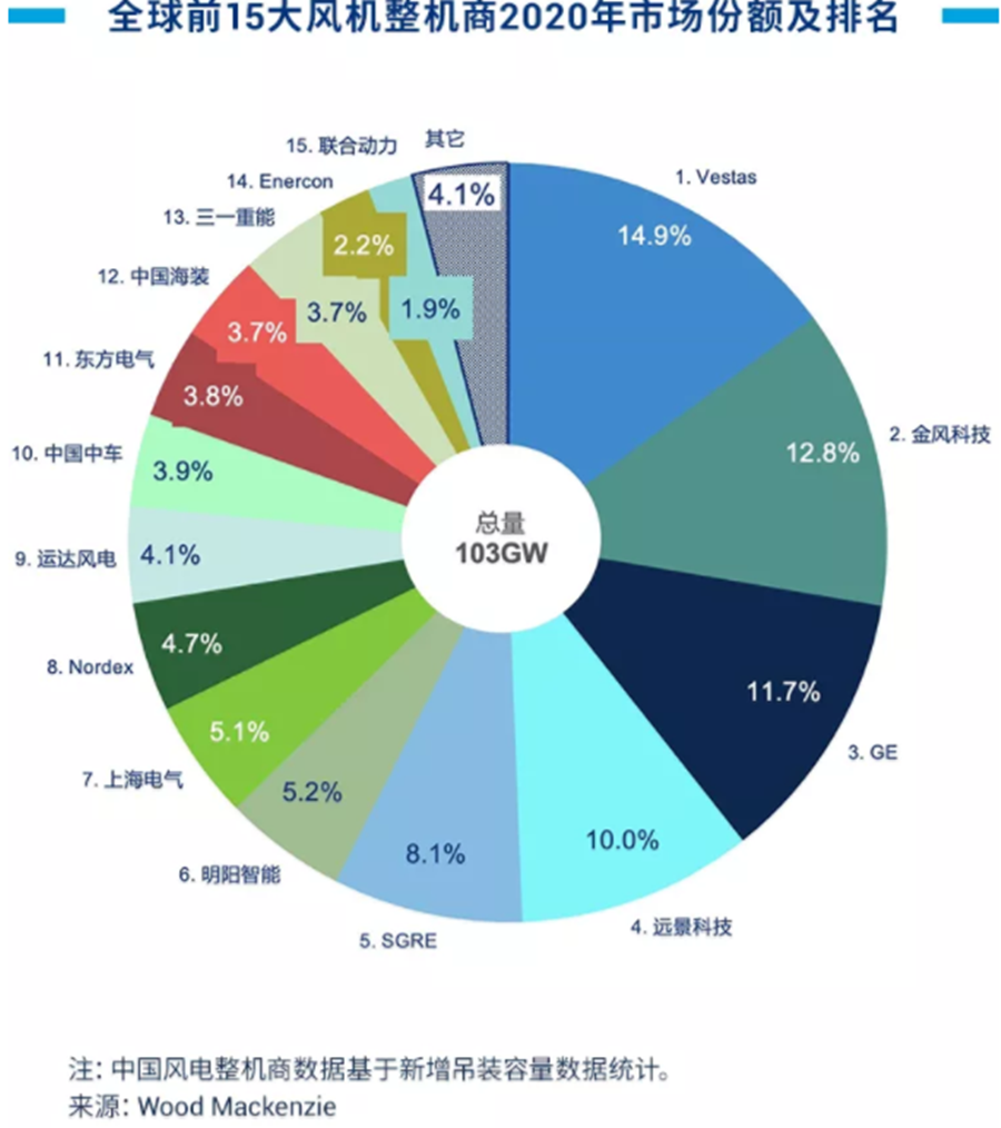 據(jù)伍德麥肯茲最新研究Global wind turbine OEMs 2020 market share(《2020年度全球風(fēng)機(jī)整機(jī)企業(yè)市場(chǎng)份額排名》),全球新增風(fēng)電裝機(jī)容量103GW。
