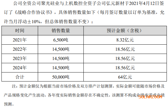 參照 PVInfoLink 最新公布的價(jià)格測(cè)算,預(yù)計(jì)合同金額約為 2021-2024 年 64億元(含稅),不含稅為 56.64 億元。該金額僅為根據(jù)當(dāng)前市場(chǎng)價(jià)格測(cè)算,實(shí)際以簽訂的月度補(bǔ)充協(xié)議為準(zhǔn)。
