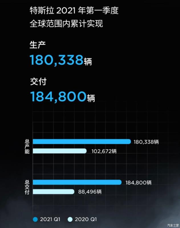 日前,特斯拉官方公布了該品牌2021年第一季度產(chǎn)能及交付數(shù)據(jù),其累計(jì)生產(chǎn)180338輛純電動(dòng)車,交付184800輛。相比2020年第一季度,該品牌純電動(dòng)車的生產(chǎn)量增加了77666輛,交付量增加了96304輛。此外,據(jù)官方表示,新款Model S和Model X全新生產(chǎn)設(shè)備已于第一季度完全安裝并通過測(cè)試,現(xiàn)已進(jìn)入批量生產(chǎn)的初期階段。