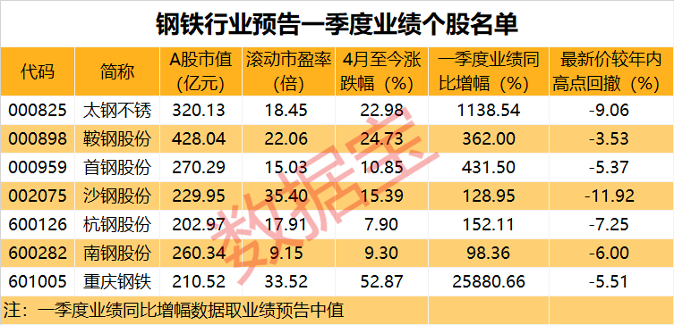 下游鋼鐵行業(yè)上市公司一季報業(yè)績也是紛紛預(yù)喜。在已公告一季報業(yè)績預(yù)告的7家鋼企中,6家凈利潤同比增幅中值超過100%。其中,預(yù)告凈利潤同比增幅最高的是重慶鋼鐵,2021年一季度凈利潤預(yù)計將增加10.8億。一眾鋼鐵商品價格創(chuàng)下近十年高點,行業(yè)火爆程度可見一斑。