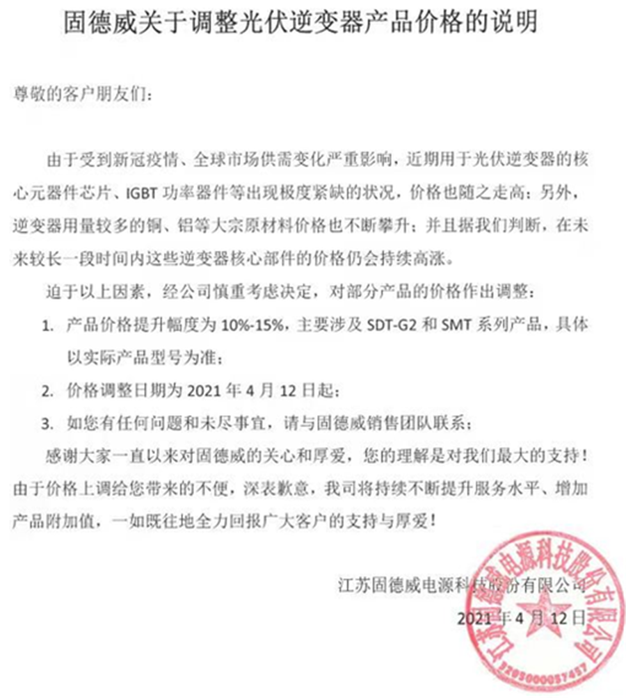 4月12日,科創(chuàng)板逆變器龍頭固德威(SH:688390)發(fā)布調(diào)整光伏逆變器產(chǎn)品價(jià)格的說(shuō)明稱,4月12日起,產(chǎn)品價(jià)格提升10%-15%,主要涉及SDT-G2和SMT系列產(chǎn)品。